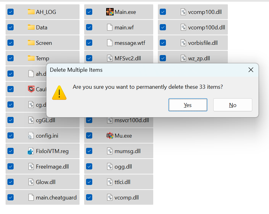 - Cách 2: Vào thư mục chứa game bằng File Explorer, Chọn tất cả các file trong thư mục MU Thế Kỷ rồi bấm Shift + DEL trên bàn phím, chọn Yes